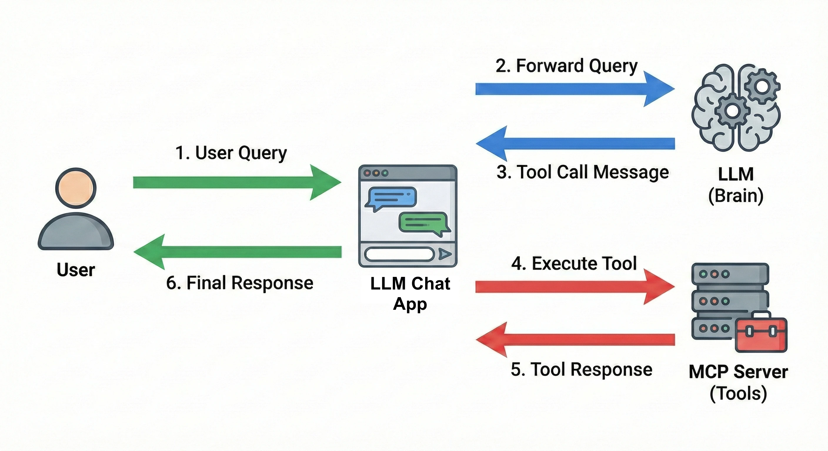- Finally, responses are sent to the LLM to generate final outputs or trigger follow-up tool calls.