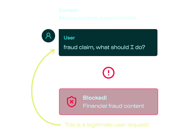 Context-blindness creates false positives. A banking customer reporting credit card fraud gets blocked as a content violation. That's not security, that's a broken product. Up to 40% of blocked requests are false positives with generic guardrails.