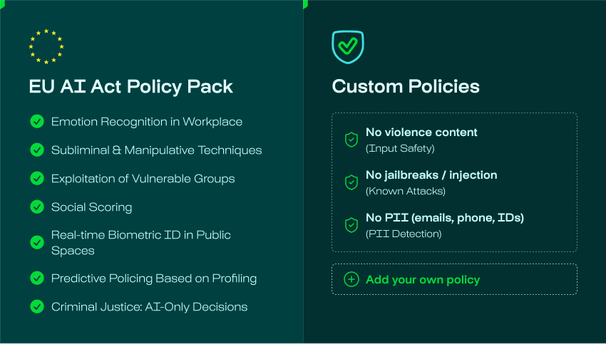 - Policy-as-Code: compliance rules expressed in OPA/Rego, versioned in Git, deployable in seconds. Pre-built packs for the EU AI Act and OWASP Top 10 for LLMs included.